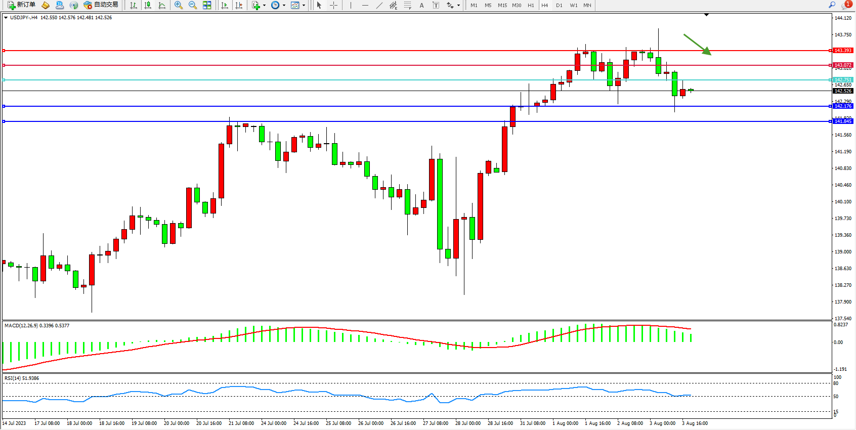 4小时图看:高位空头力度震荡下行,短期跌势或将延续,市场空头情绪笼罩,MACD指标处于多头区域维持整理,RSI指标处于50均衡线附近徘徊;