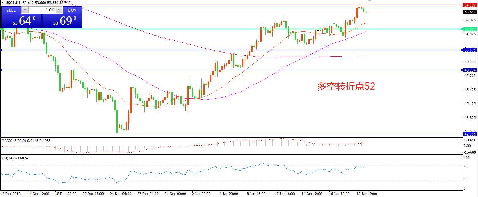 4小时图看,油价经过连续整理站稳52美元,短期整理后受制于54美元关口, 均线系统呈多头排列, MACD红柱增加,重点关注上方阻力。