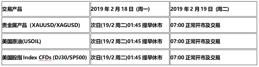 由于美国总统日假期 (2019年2月18日周一),以下交易产品的交易时间将受美国市场假期休市影响,敬请阁下留意知悉!