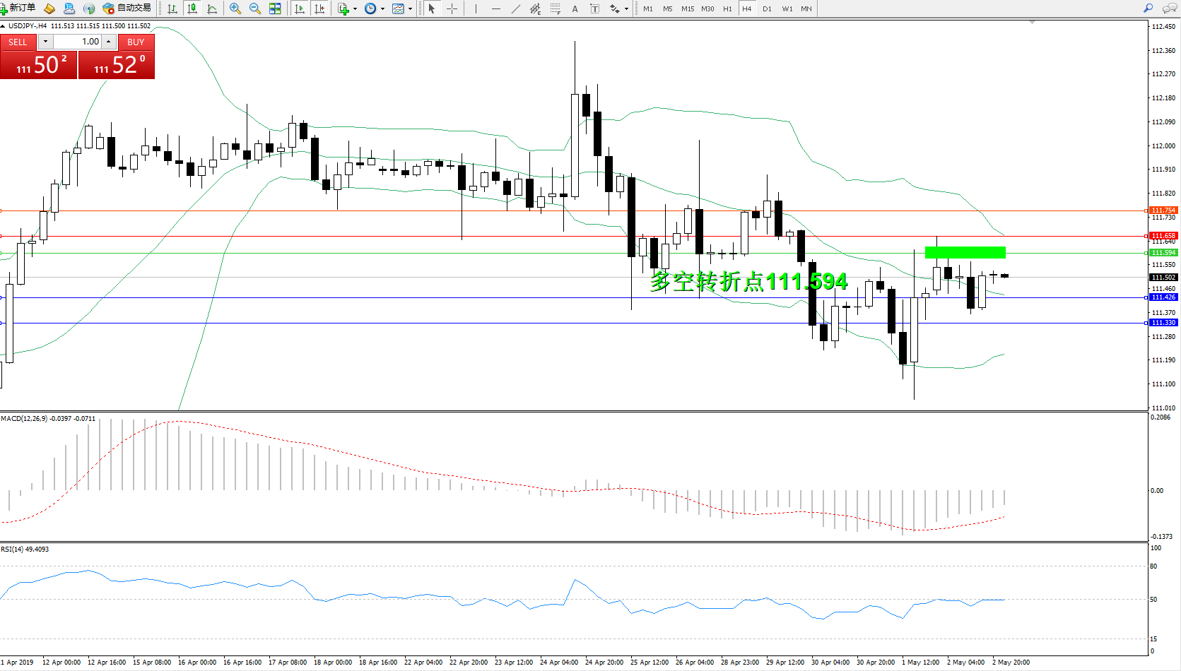 交易策略:111.594下方看跌,目标111.426111.330