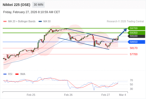 在 58650 之上,看涨,目标价位为 59350 ,然后为 59700 。