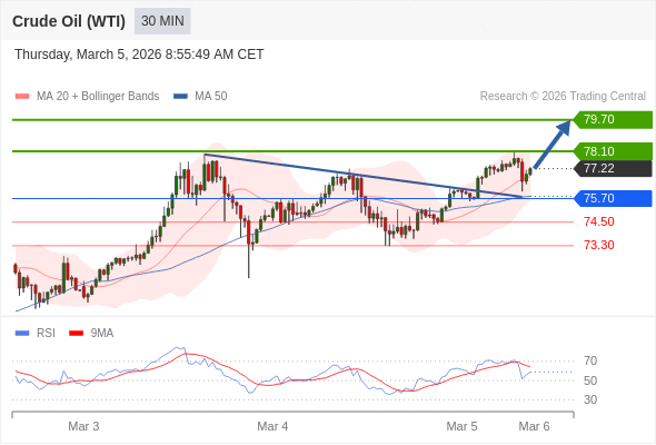 在 75.70 之上,看涨,目标价位为 78.10 ,然后为 79.70 。
