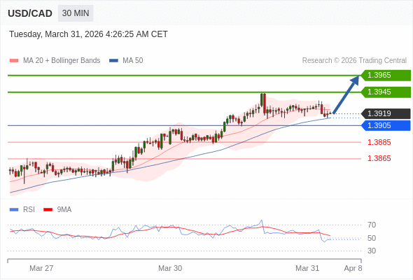 在 1.3905 之上,看涨,目标价位为 1.3945 ,然后为 1.3965 。