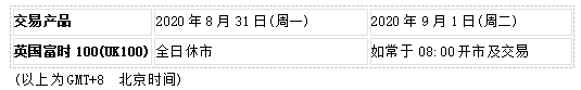因应2020831日为英国市场夏季银行假期,英国富时100指数UK100将于2020831()全日休市,敬请知悉留意!