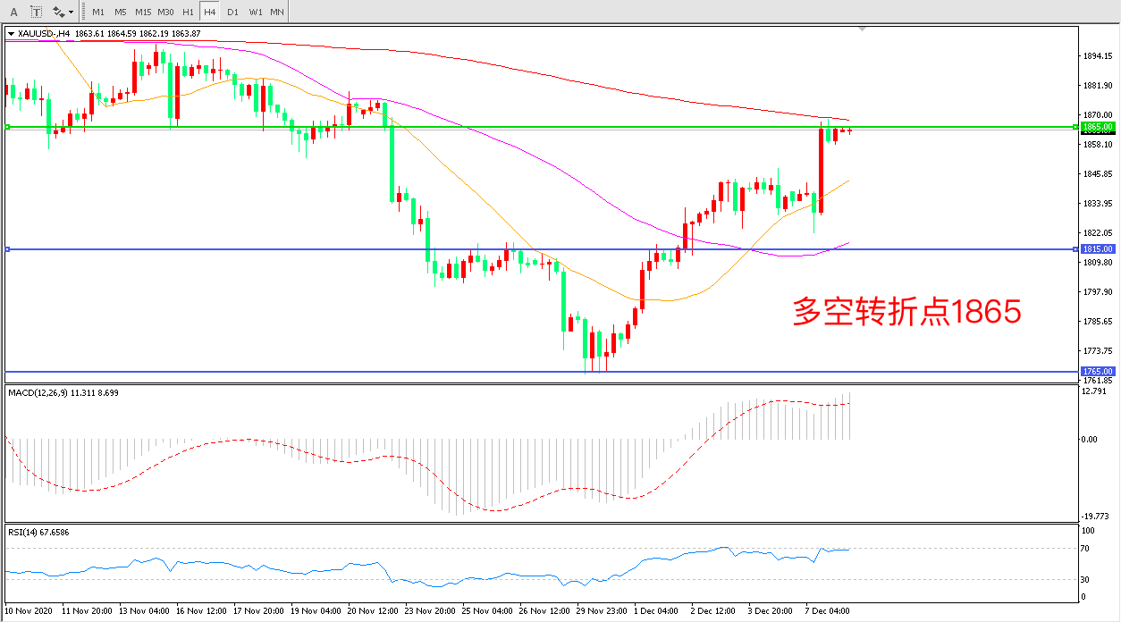 4小时图看,金价低位大幅拉升,短期走势异常强势1865成为上方重要阻力如能顺势突破有望掀起新一轮的大涨均线系统拐头向上MACD红柱增加,RSI指标走平,日内震荡上行概率较大。