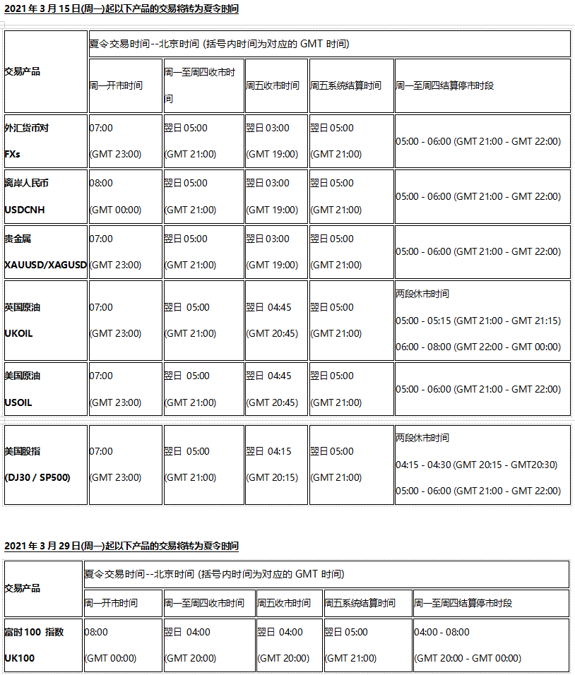 因应北美时区2021314(周日)欧洲时区2021328(周日)分别开始转夏令时间, 以下欧美市场各产品交易时间将调整为夏令时交易时间,敬请阁下留意知悉!