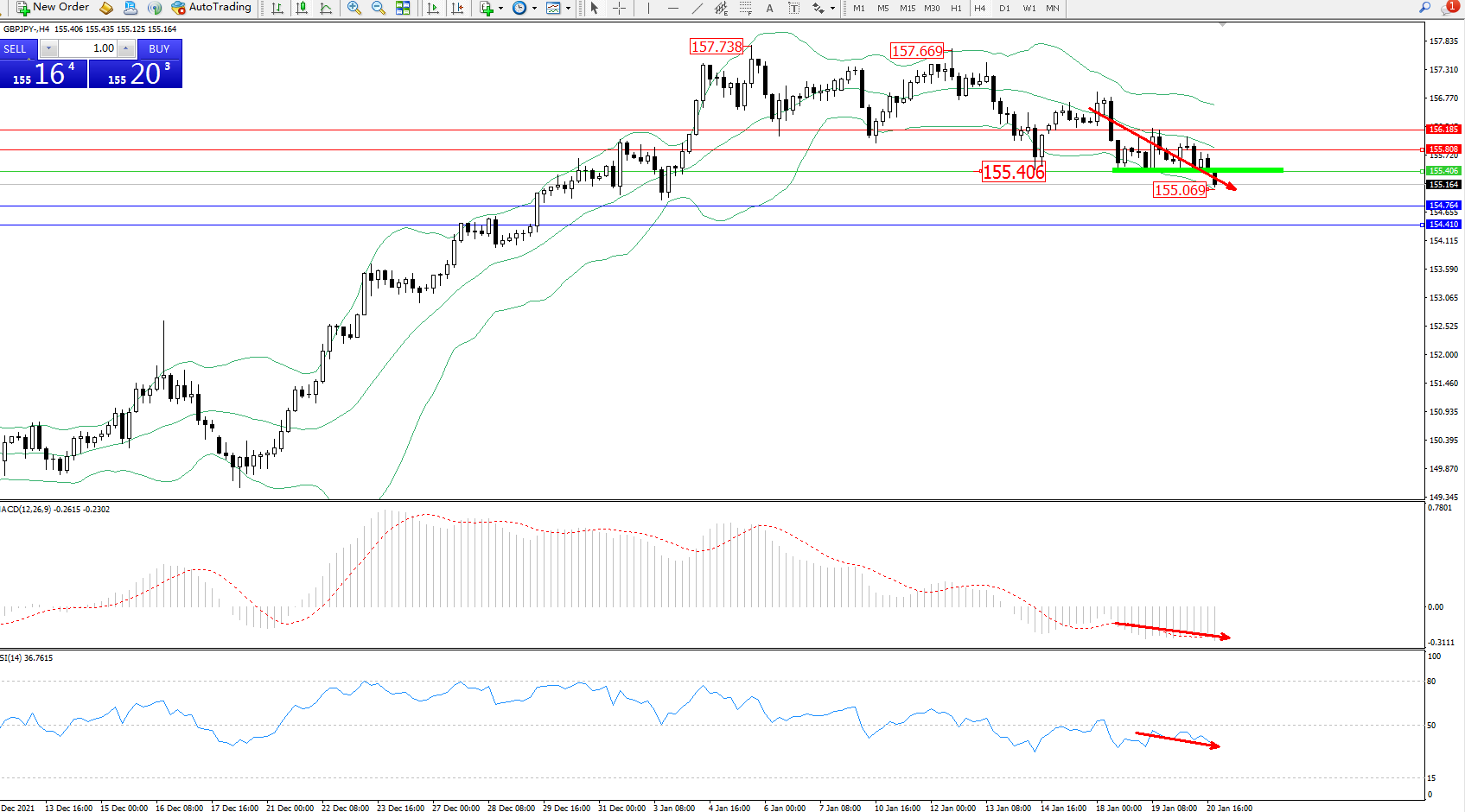交易策略:155.406下方看跌,目标154.764、154.410