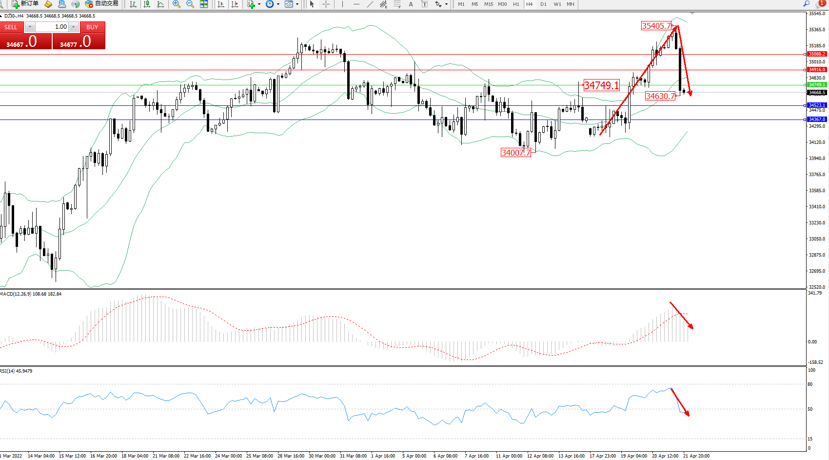 技术点评:多头动力延续布林带指标通道中上轨区间持续震荡上扬,高位抵达35405附近节点后遇阻回撤,市场空头情绪笼罩,跌破布林带指标中轨进入中下轨区间震荡,短期高位下行态势或将持续,布林带指标呈张口走势后开始收口,MACD指标处于多头区域维持震荡下行,RSI指标处于多头区域急速下挫至50均衡线下侧徘徊中;