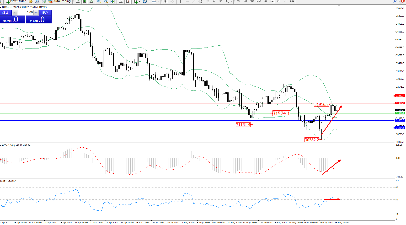 道琼斯指数DJ30——4小时K线图显示: