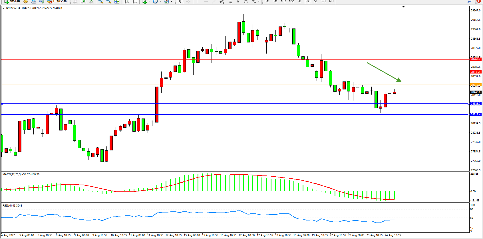 日经指数JPN225——4小时K线图显示: