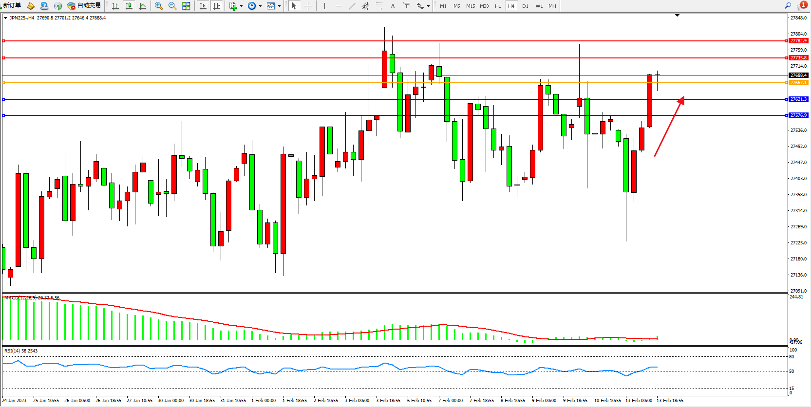 日经指数JPN225——4小时K线图显示: