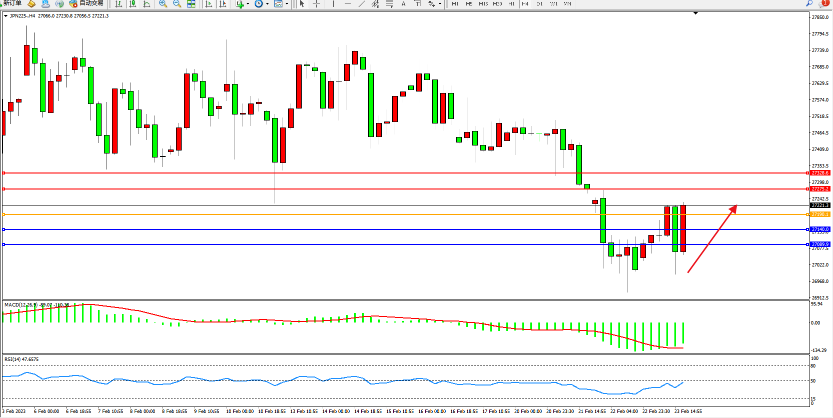 日经指数JPN225——4小时K线图显示: