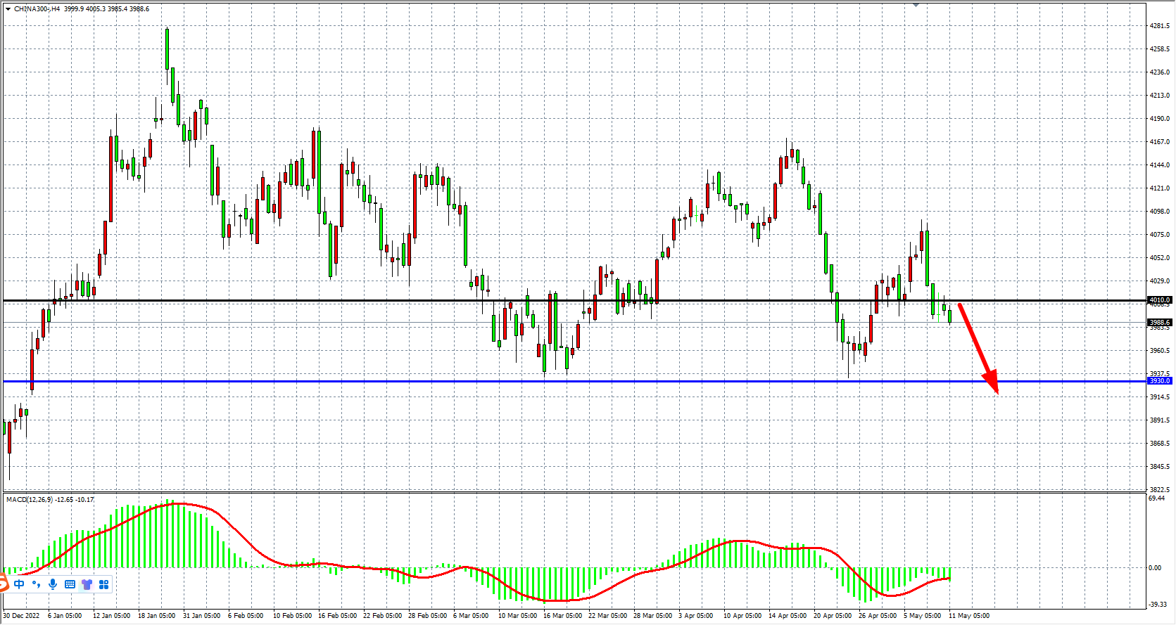 4小时图看,沪深300进一步回落下破4000点,短期趋势走弱,MACD量能在零轴下有所放量,多头存在回调压力,当前4010压力明显,该位之下继续看跌,目标3960-3930附近