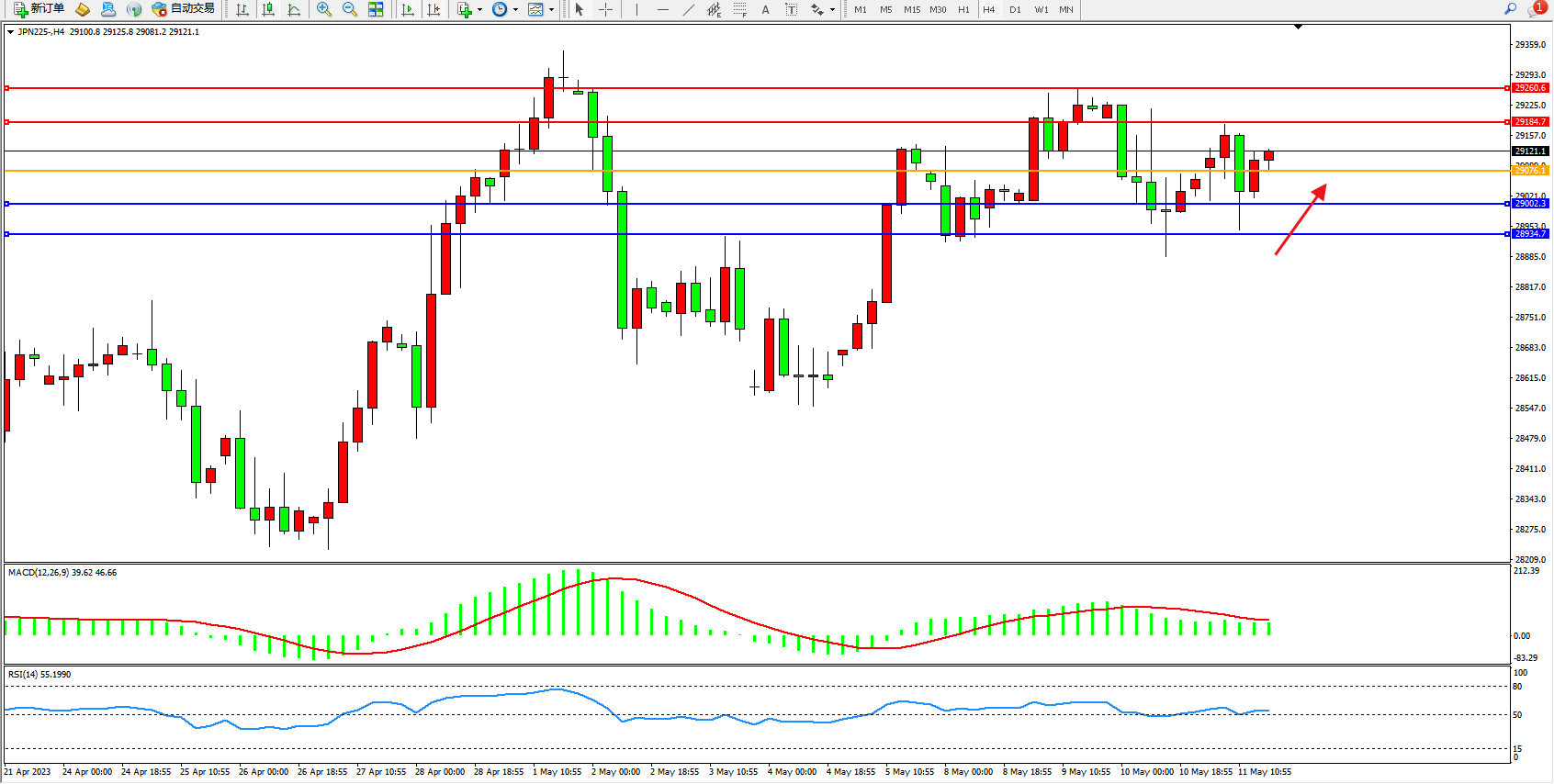 日经指数JPN225——4小时K线图显示: