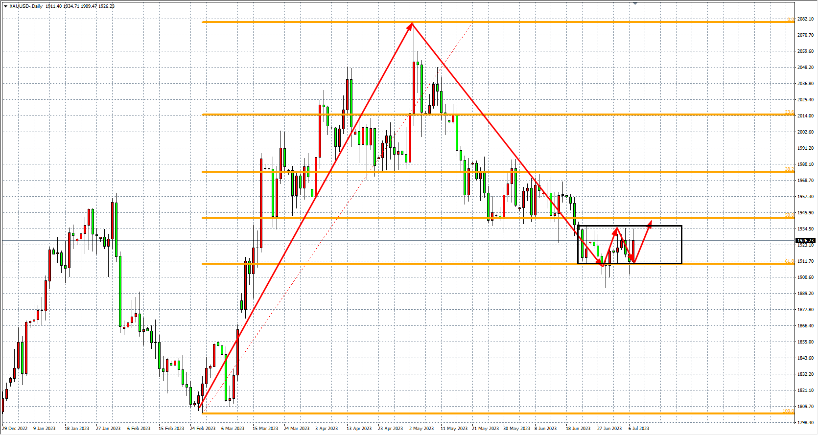 上周(7月3日-7月7日)现货黄金守住1900关口小幅反弹,周线在三连阴后首次收阳。
