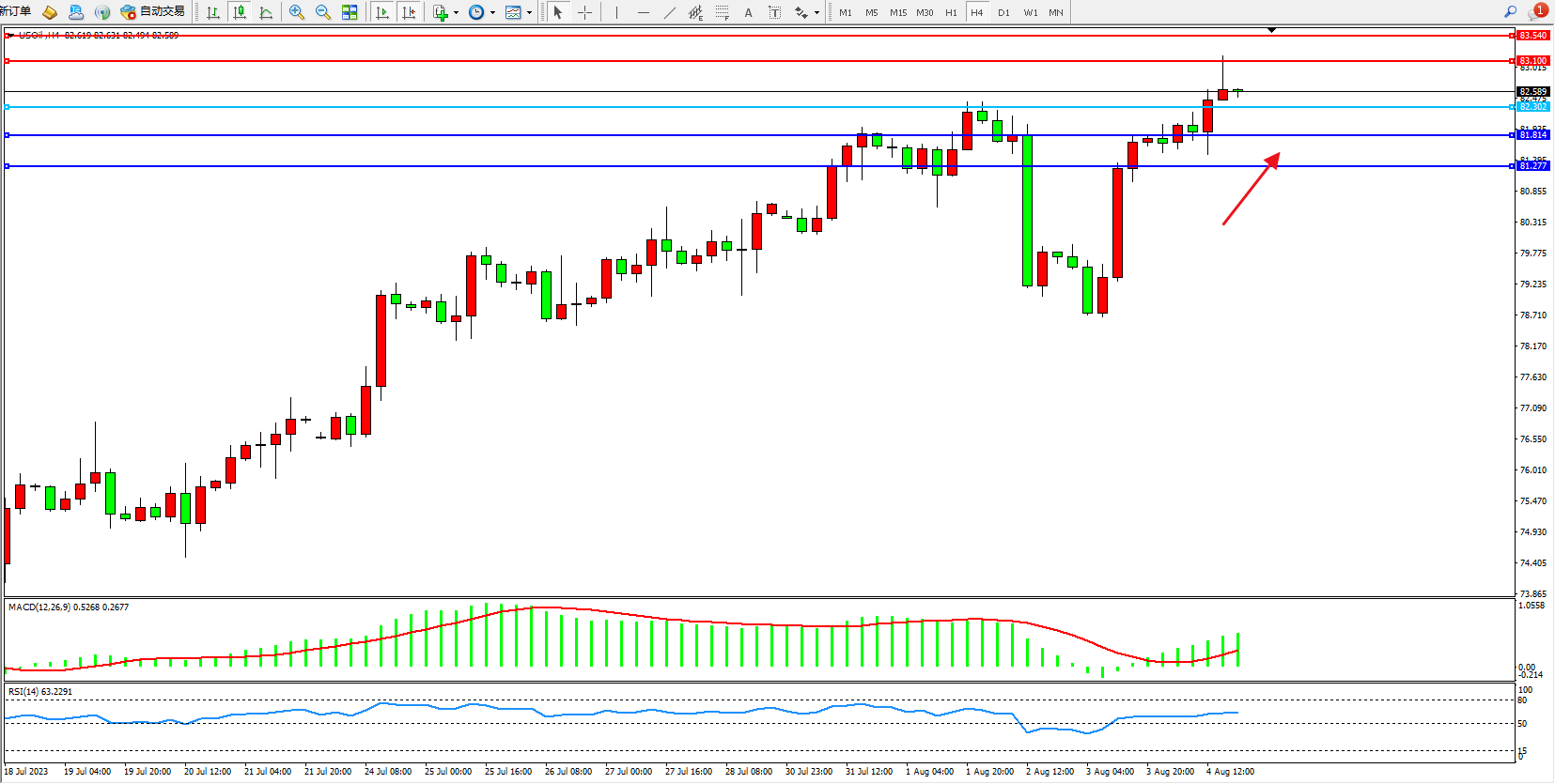 原油USOil——4小时K线图显示: