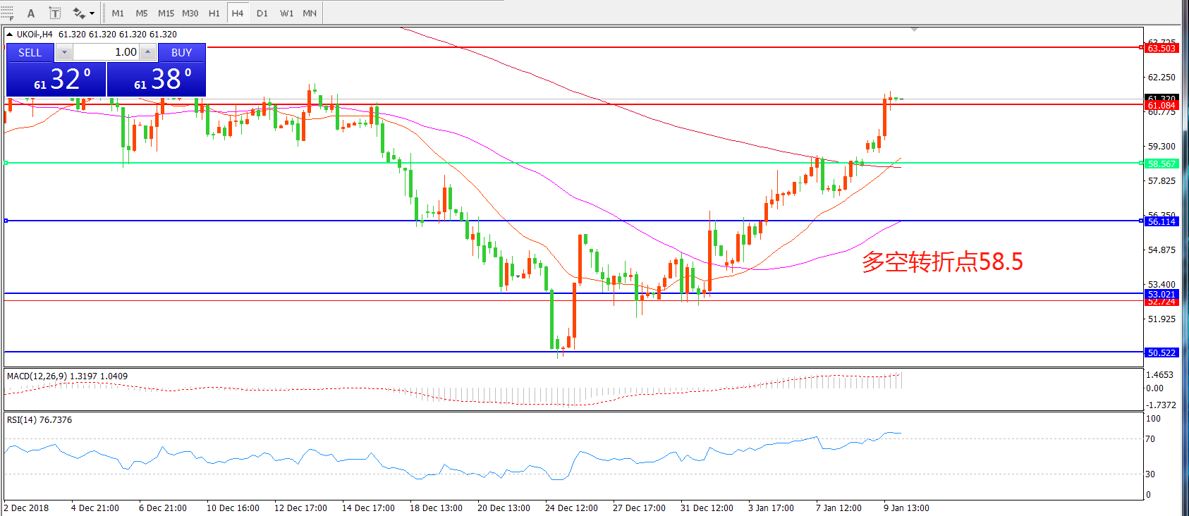 4小时图看,油价站稳58.5美金后稳步上行, 21与55均线形成金叉,MACD红柱增加,RSI指标处于超买区域,短线有回落风险,但整体走势偏多。